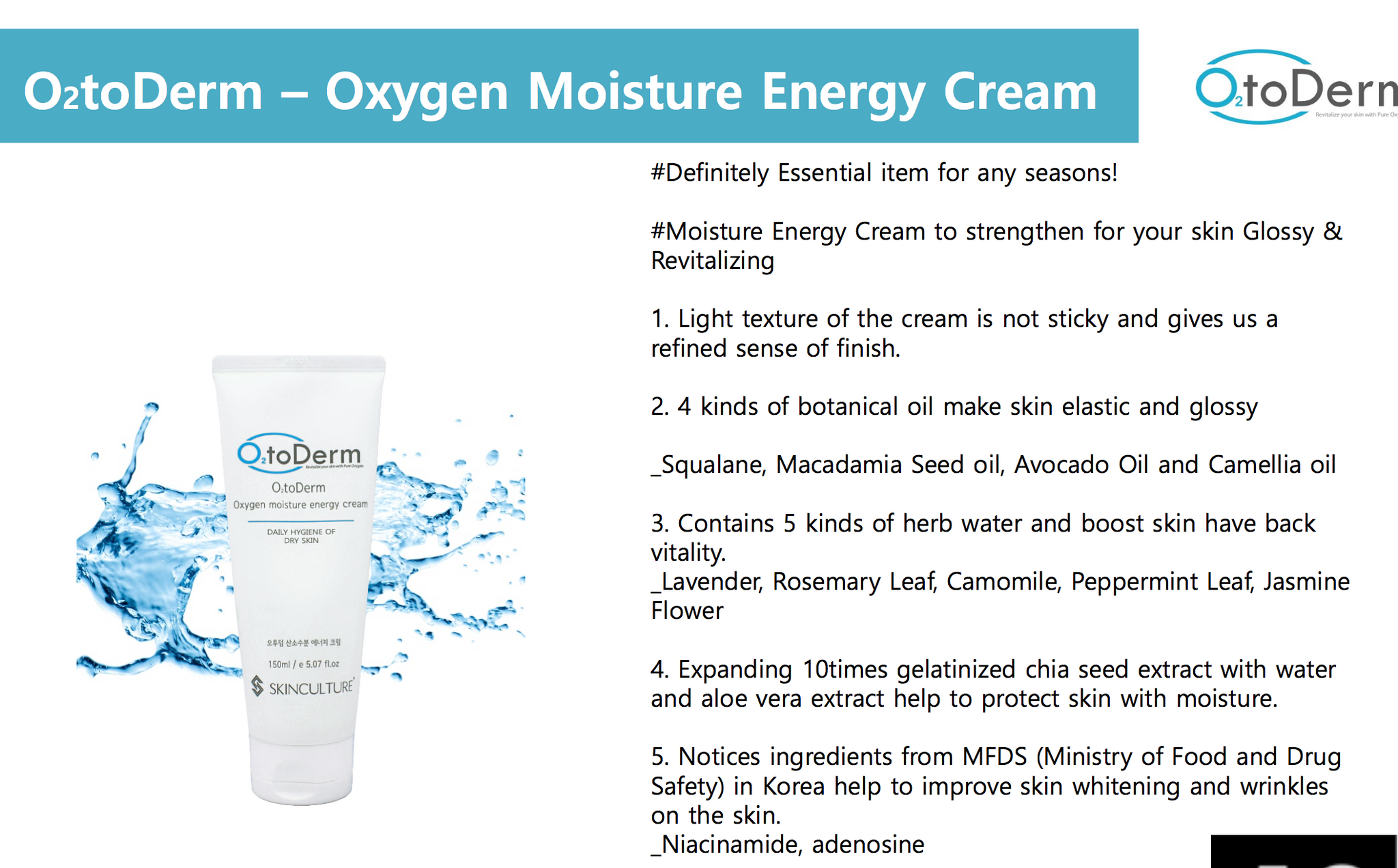 This lightweight and creamy oxygen cream moisturizer nourishes and rejuvenates the skin, promoting a healthy and glowing appearance. It contains a blend of four vegetable oils (squalane, macadamia seed, avocado, and camellia) and various herbs (lavender, rosemary, chamomile, peppermint, and jasmine) that offer numerous advantages for the skin. Additionally, the moisturizer includes aloe vera leaf extract to heal and hydrate the skin, along with medical herbs like niacinamide and adenosine which brighten the skin and reduce signs of aging.